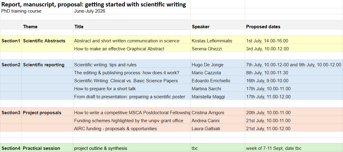 Course learning outcomes/abstract: this course is designed to help PhD students become more effective and efficient in writing scientific communications (abstracts, reports and articles) and grant proposals, by providing them with practical tools, examples, and exercises. By the end of this course, participants will have developed a strong foundation in essential writing skills required for project reporting, manuscript preparation, and grant proposal development. Course Overview Section 1: Scientific abstract preparation Here we focus on what makes an abstract impactful, looking at the structural, stylistic and formatting elements to consider. The subtopics treated will include: • Abstract writing for conference submission • Abstract writing for scientific manuscript • Graphical abstracts Section 2: Scientific reporting and manuscript drafting In this section, we focus on the principles and techniques necessary for creating well-organized, clear, and engaging scientific reports and manuscripts. Subtopics include: • Introduction to Effective Writing: Overview of principles for clarity, coherence, and conciseness, along with common pitfalls to avoid. • Crafting Strong Sentences and Paragraphs: Strategies for constructing effective sentences and paragraphs that convey complex ideas with simplicity and precision. • Organizing Content and Streamlining the Writing Process: Practical methods for outlining and structuring papers to enhance readability and simplify the writing process. • Manuscript Formatting: Understanding the format and components of an original research manuscript, with a focus on crafting the abstract, introduction, methods, results, and discussion. • Types of Scholarly Articles and the Publication Process: An exploration of the differences between original research papers, reviews, commentaries, and opinion pieces, along with an overview of the publication and peer review process. Disscussion on Predatory journals and unethical publishing. • Conference Communication: Training on how to create effective posters and talks and communicate scientific findings to lay and scientific audiences, with insights from invited journal editors. Section 3: Project proposal writing The third part of the course transitions to the specific skills required for successful scientific proposal writing. Subtopics for this section include: • Differences Between Scientific Papers and Grant Proposals: Key distinctions in style, purpose, and structure, along with tips on adapting writing skills for grant proposals. • Funding Opportunities and Resources: Insights into local and international fellowship opportunities with guest presentations, e.g., from UniPV and AIRC Grant Offices. • Structuring a Competitive Proposal: Step-by-step guidance on organizing a compelling proposal, targeting different types of funding schemes.